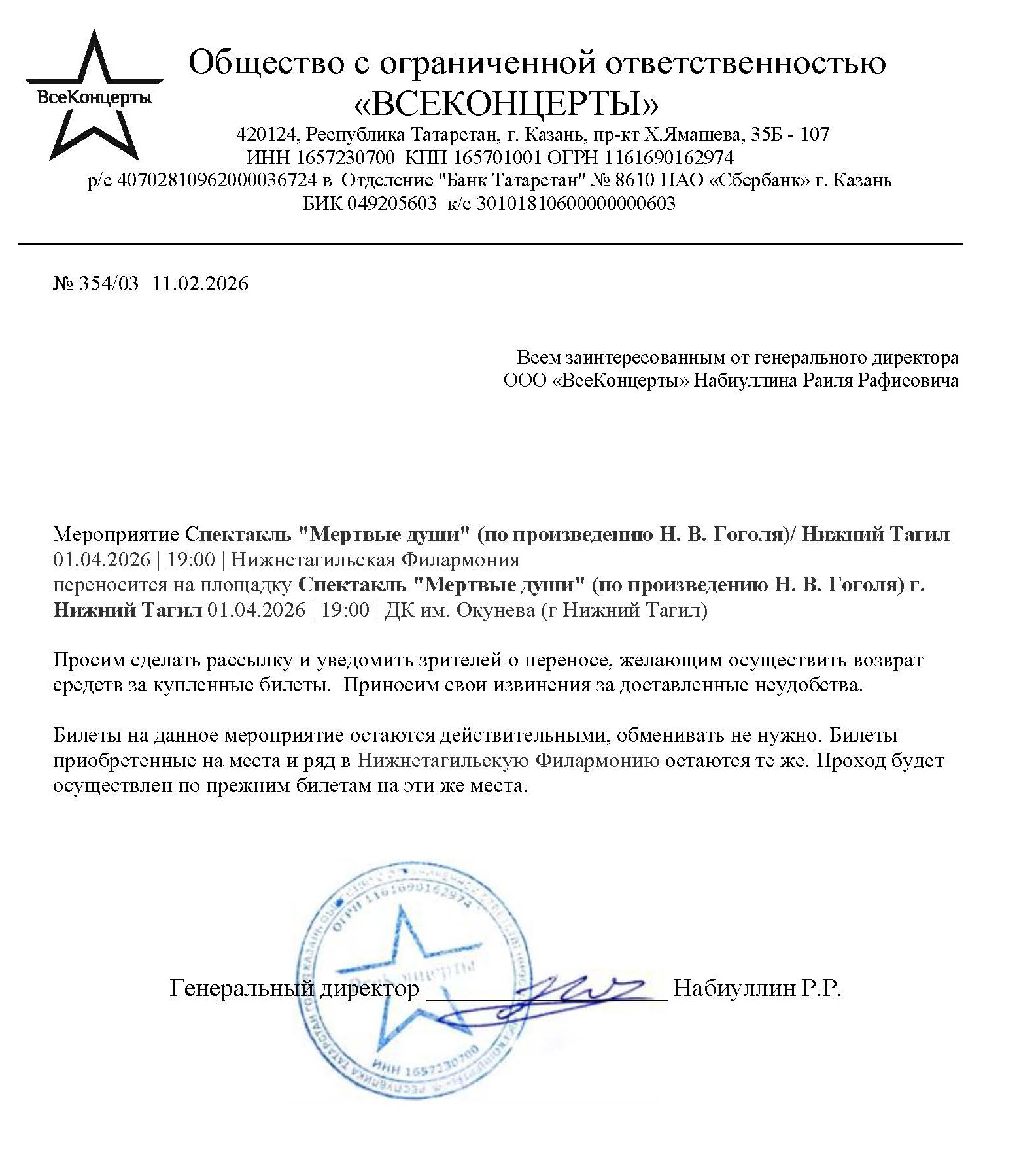 Уважаемый клиент! Спешим сообщить, что по информации, полученной от организатора, спектакль «Мертвые души» (по произведению Н. В. Гоголя), запланированный на 1 апреля 2026 года в 19:00 в Нижнетагильской Филармонии, перенесён на другую площадку. Новое место проведения спектакля - ДК Окунева / г. Нижний Тагил, проспект Вагоностроителей, дом 1 / Ранее приобретенные билеты действительны на новую площадку, обменивать их не нужно. Если вам не удобно посетить спектакль на новой площадке, вы можете вернуть билет по кнопке в личном кабинете во вкладке «Заказы». Деньги за электронные билеты вернутся автоматически в полном объёме на карту, с которой была произведена оплата. Если вы купили билет в кассе Ticketland.ru за наличный расчет, то обратитесь, пожалуйста, на почту: vozvrat@ticketland.ru. С уважением, команда поддержки Ticketland.