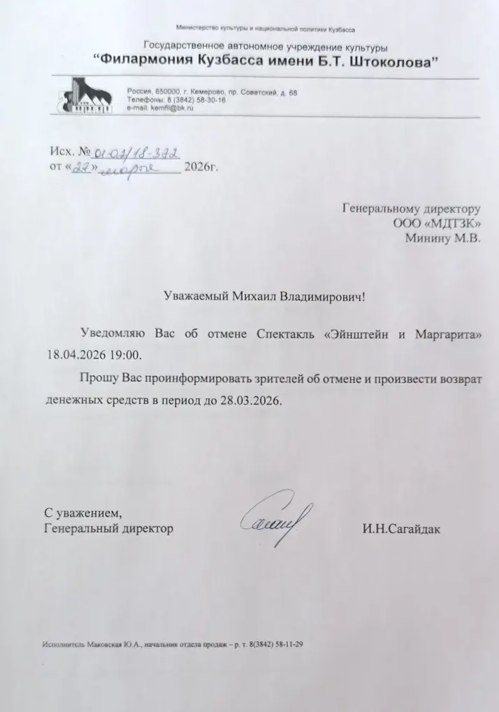 Уважаемый клиент! Спешим сообщить, что по информации, полученной от организатора, спектакль «Эйнштейн и Маргарита», запланированный на 18 апреля 2026 года в 19:00 в Филармонии Кузбасса, отменён. Деньги за электронные билеты вернутся автоматически в полном объёме на карту, с которой была произведена оплата. Если вы купили билет в кассе Ticketland.ru за наличный расчет или оплатили подарочной картой, то обратитесь, пожалуйста, на почту: vozvrat@ticketland.ru. С уважением, команда поддержки Ticketland.