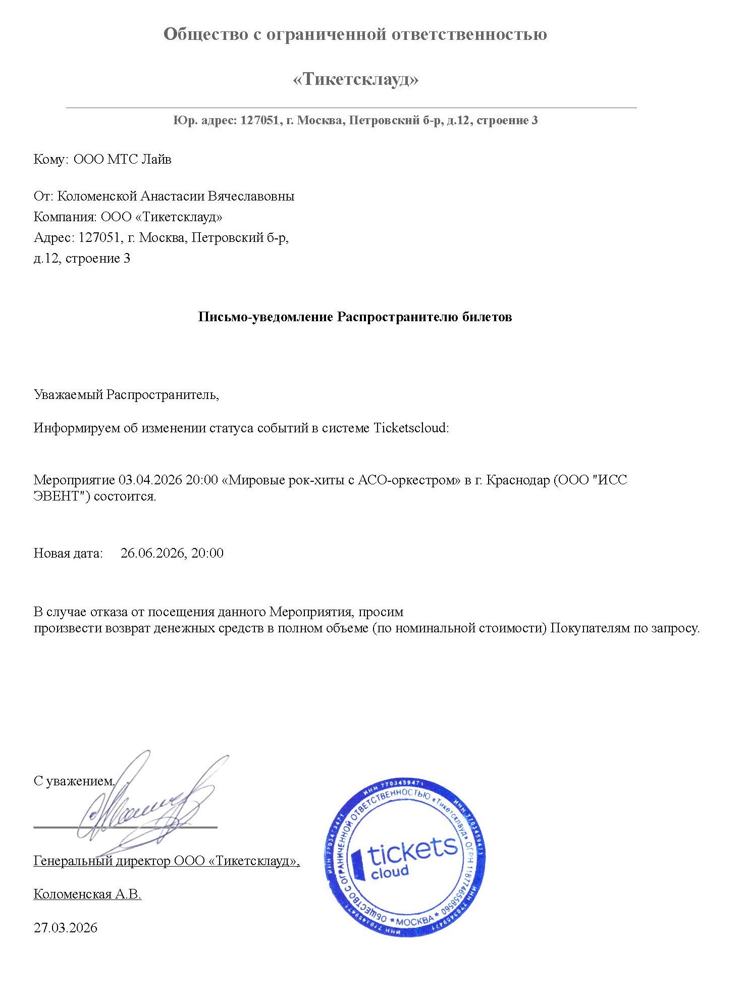Уважаемый клиент! Спешим сообщить, что по информации, полученной от организатора, концерт «Мариам Мерабова. Латина в джазе», запланированный на 6 апреля 2025 года в 13:00 в Доме музыки, перенесен на 4 апреля 2026 года. Ранее приобретенные билеты действительны на новую дату, обменивать их не нужно. Если вам не удобно посетить мероприятие в новую дату, вы можете вернуть билет по кнопке в личном кабинете во вкладке «Заказы» (16 апреля 2025 г.). Деньги за электронные билеты вернутся автоматически в полном объёме на карту, с которой была произведена оплата. Если вы купили билет в кассе Ticketland.ru за наличный расчет, то обратитесь, пожалуйста, на почту: vozvrat@ticketland.ru. С уважением, команда поддержки Ticketland