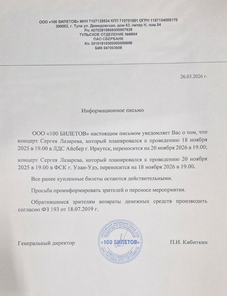 Уважаемый клиент! Спешим сообщить, что по информации, полученной от организатора, концерт Сергея Лазарева «Шоумен», запланированный на 20 ноября в 19:00 2025 года в физкультурно-спортивном комплексе, переносится на 20 ноября 2026 года. Ранее приобретенные билеты действительны, обменивать их не нужно. Если вы не хотите посетить мероприятие, вернуть билет можно по кнопке в личном кабинете во вкладке «Заказы». Деньги за электронные билеты вернутся автоматически в полном объёме на карту, с которой была произведена оплата. Если вы купили билет в кассе Ticketland.ru за наличный расчет, то обратитесь, пожалуйста, на почту: vozvrat@ticketland.ru. С уважением, команда поддержки Ticketland