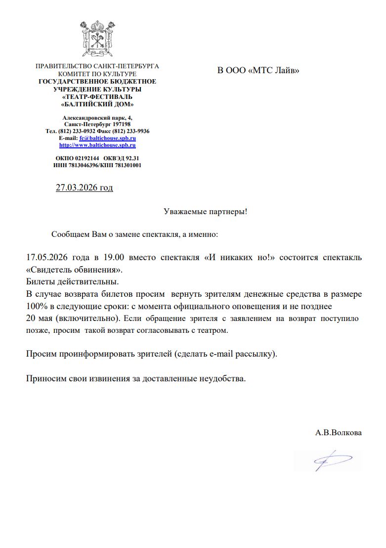 Уважаемый клиент! Спешим сообщить, что по информации, полученной от организатора, спектакль «И никаких но!», запланированный на 17 мая 2026 года в 19:00 в Театр-фестивале «Балтийский дом», заменён на спектакль «Свидетель обвинения». Ранее приобретенные билеты действительны, обменивать их не нужно. Если вам не удобно посетить спектакль, вы можете вернуть билет по кнопке в личном кабинете во вкладке «Заказы» (до 20 мая 2026 года включительно). Деньги за электронные билеты вернутся автоматически в полном объёме на карту, с которой была произведена оплата. Если вы купили билет в кассе Ticketland.ru за наличный расчет или оплатили Подарочной картой, то обратитесь, пожалуйста, на почту: vozvrat@ticketland.ru. С уважением, команда поддержки Ticketland.
