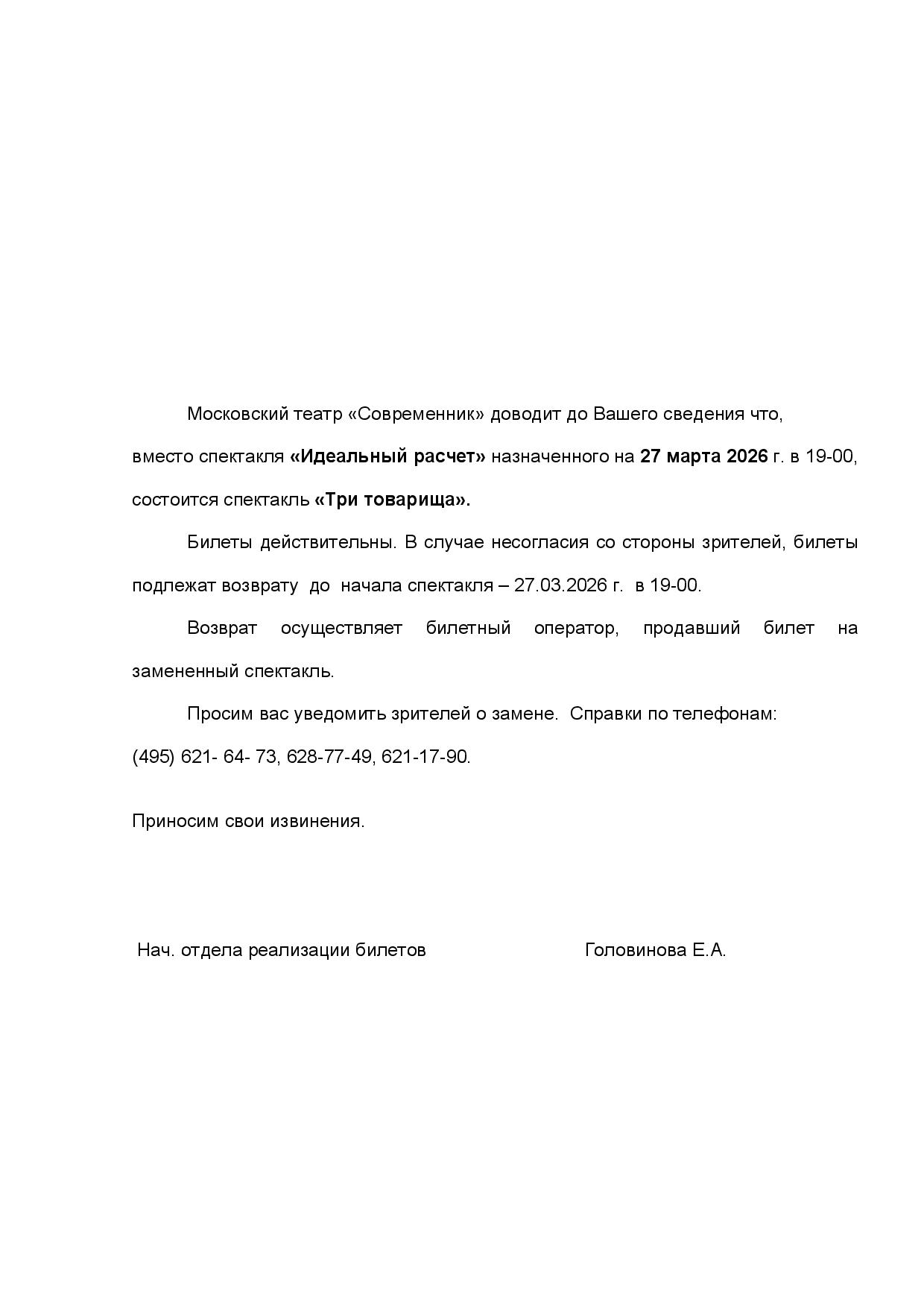 Уважаемый клиент! Спешим сообщить, что по информации, полученной от организатора, спектакль «Идеальный расчет», запланированный на 27 марта 2026 года в 19:00 в театре «Современник», заменён на спектакль «Три товарища». Ранее приобретенные билеты действительны, обменивать их не нужно. Если вам не удобно посетить спектакль, вы можете вернуть билет по кнопке в личном кабинете во вкладке «Заказы» (до 27.03.2026 19:00). Деньги за электронные билеты вернутся автоматически в полном объёме на карту, с которой была произведена оплата. Если вы купили билет в кассе Ticketland.ru за наличный расчет или оплатили Подарочной картой, то обратитесь, пожалуйста, на почту: vozvrat@ticketland.ru. С уважением, команда поддержки Ticketland.