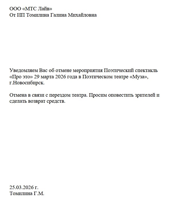 Уважаемый клиент! Спешим сообщить, что по информации, полученной от организатора, поэтический спектакль «Про это», запланированный на 29 марта 2026 года в 18:00 в Поэтическом театре «Муза», перенесён на 11 апреля 2026 года, начало в 17:00. Ранее приобретенные билеты действительны на новую дату, обменивать их не нужно. Если вам не удобно посетить спектакль в новую дату, вы можете вернуть билет по кнопке в личном кабинете во вкладке «Заказы». Деньги за электронные билеты вернутся автоматически в полном объёме на карту, с которой была произведена оплата. Если вы купили билет в кассе Ticketland.ru за наличный расчет или оплатили подарочной картой , то обратитесь, пожалуйста, на почту: vozvrat@ticketland.ru. С уважением, команда поддержки Ticketland.