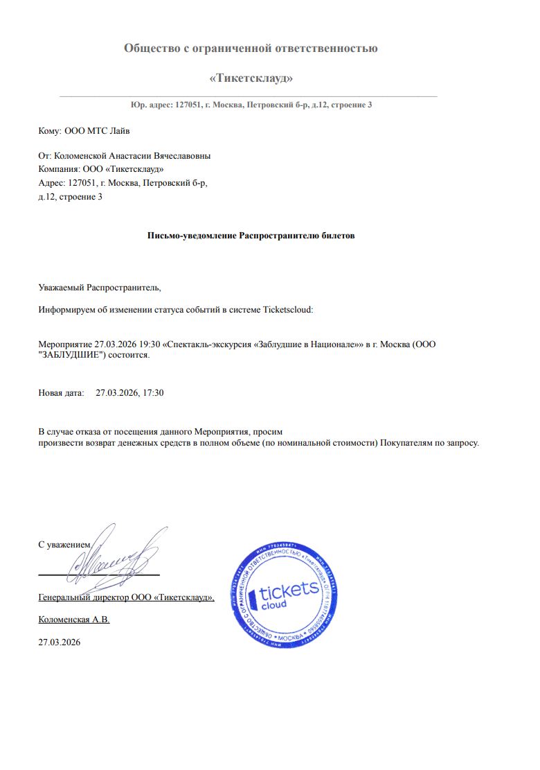 Уважаемый клиент! Спешим сообщить, что по информации, полученной от организатора, спектакль-экскурсия «Заблудшие в Национале», запланированный на 27 марта 2026 года в 19:30 в отеле «Националь», перенесён на 17:30. Если вам не удобно посетить мероприятие в новое время, вы можете вернуть билет по кнопке в личном кабинете во вкладке «Заказы» (до 27.03.2026 17:30). Деньги за электронные билеты вернутся автоматически в полном объёме на карту, с которой была произведена оплата. Если вы купили билет в кассе Ticketland.ru за наличный расчет или оплатили подарочной картой , то обратитесь, пожалуйста, на почту: vozvrat@ticketland.ru. С уважением, команда поддержки Ticketland