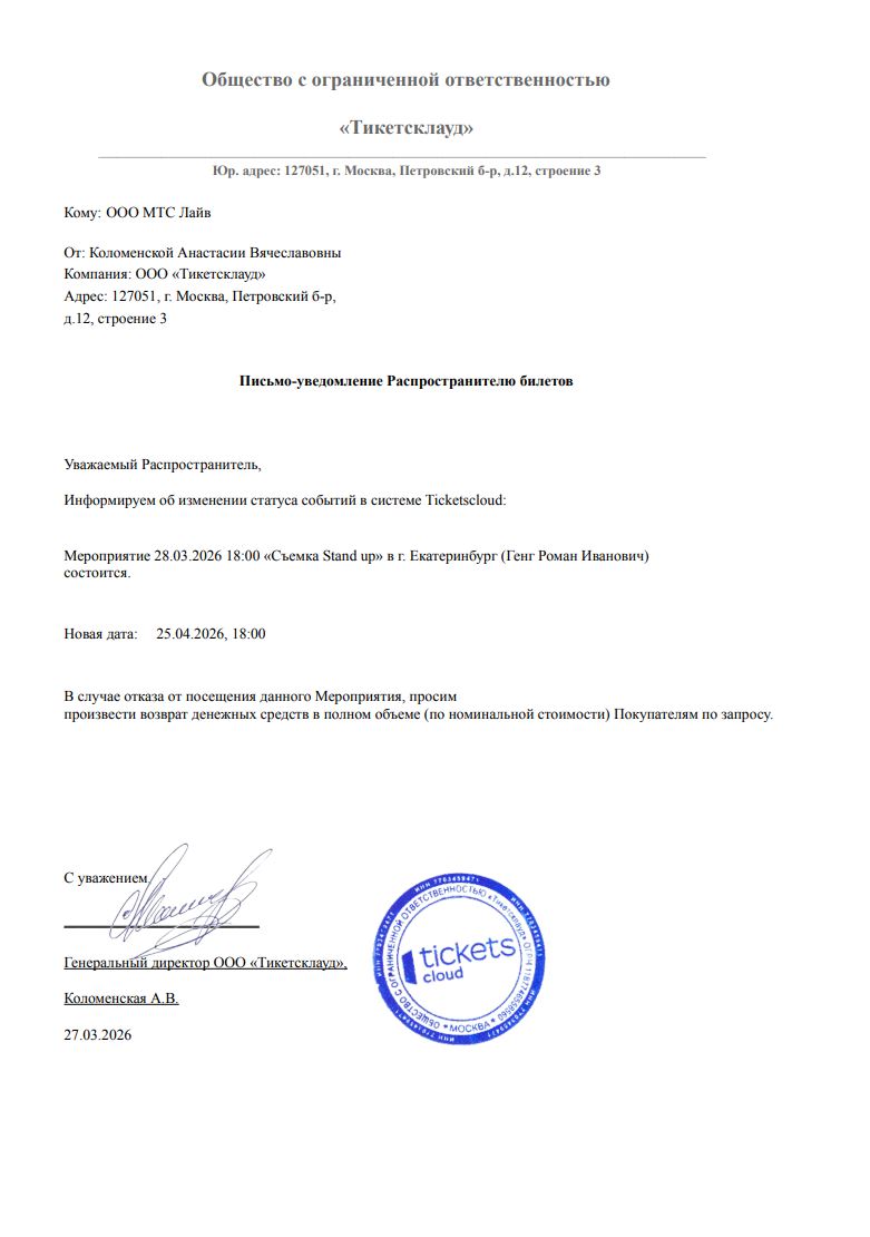Уважаемый клиент! Спешим сообщить, что по информации, полученной от организатора, Съемка Stand up, запланированная на 28 марта 2026 года в 18:00 в «Немузеймусора», перенесена на 25 апреля 2026 года, начало в 18:00. Ранее приобретенные билеты действительны, обменивать их не нужно. Если вам не удобно посетить балет, вы можете вернуть билет по кнопке в личном кабинете во вкладке «Заказы». Деньги за электронные билеты вернутся автоматически в полном объёме на карту, с которой была произведена оплата. Если вы купили билет в кассе Ticketland.ru за наличный расчет или оплатили подарочной картой, то обратитесь, пожалуйста, на почту: vozvrat@ticketland.ru. С уважением, команда поддержки Ticketland.